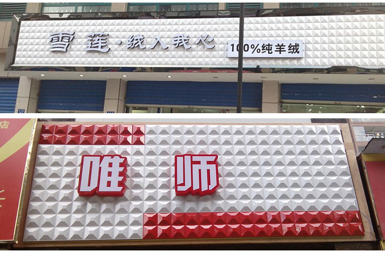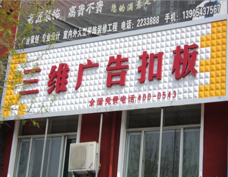 三维扣板是一种新型的装饰材料,有很强的立体感,环保健康、使用寿命长。色彩多变,款式新颖,可以多种颜色自由的组合,被广泛用于各类广告招牌制作,深受客户们喜爱。