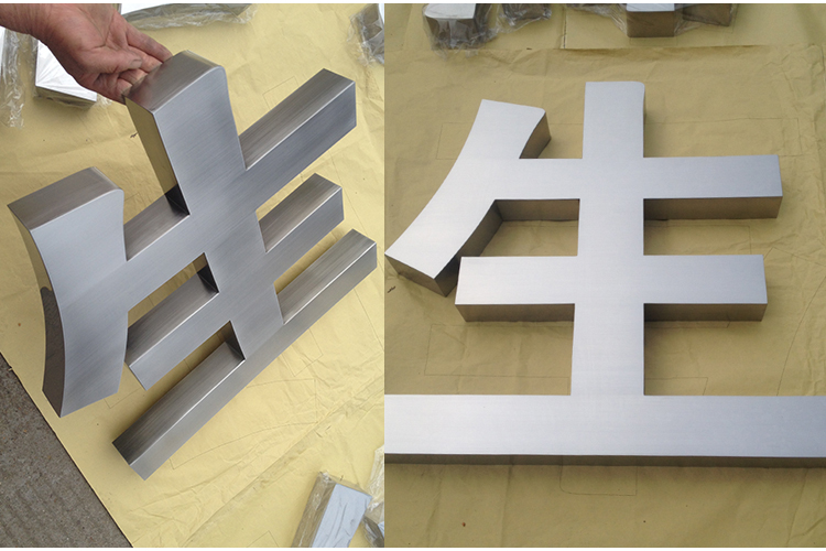 不锈钢字分为发光和不发光两种,独特的金属质感,常用的有哑面和镜面之分,非常酷炫。缺点:户外使用有可能因为金属的折射阳光导致笔画不清晰。