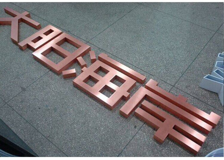 铜比较容易氧化,做成广告字通常进行电镀或抛光处理后再涂防锈漆,做成字后不易生锈。颜色金光闪闪,给人感觉富丽堂皇,自带威严,通常政府部门应用较多。