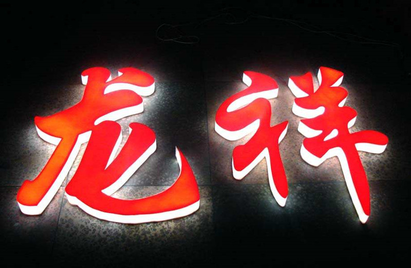 俗称背打光字,就是字背面打光,光源安装在不锈钢字背面字壳内,工艺精细,高端雅致。常用的做法是,不锈钢折弯打磨精工制作,内置LED光源,字底用亚克力刻成字形(也有不套亚克力底的)。基底一般采用磨砂亚克力,背光更亮。