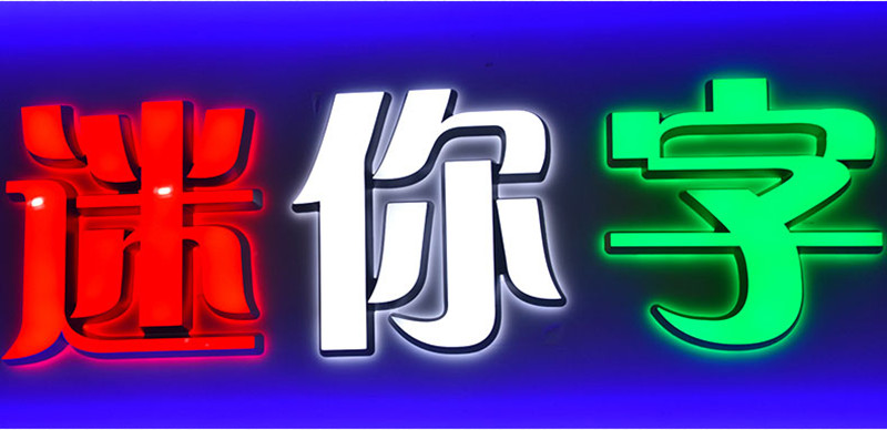 显著特点是底部面积要比字面面积大,发光面积更广泛,线条柔和,三维效果突出,即使在远处也能从各个角度看到清晰的发光,字体层次分明。迷你字的制作工艺和过程是,分别雕刻出底板、背面透明亚克力板,通过三维雕刻出表面字壳,字壳烤漆。在底板上固定防水LED高亮灯,字壳用胶水固定。